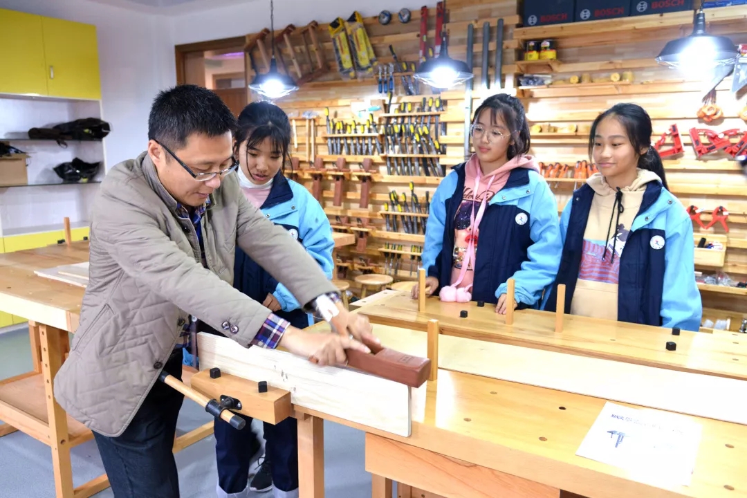 這里像是一個車間,墻上掛滿了刨、鋸、銼、尺等精良的木工工具,各處有不同功能的工作臺和設備。這間精致的木工制作室是巨人控股特意為學生投資興建的,其愿望就是要讓更多的學生掌握勞動技能、領悟工匠精神,從木工制作中獲得勞動的快樂、懂得勞動的價值,不僅讓知識改變命運,也可通過勞動獲得知識、讓勞動改變命運。木工制作室的設立,彌補了重知識、輕實踐的教學不足。